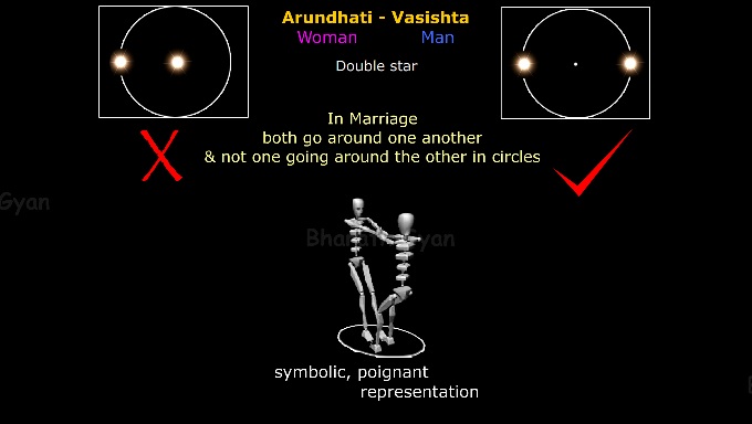 In our marriage , we were asked to see the Arundathi/vashishtha star . In case you don’t know, it’s a binary star combination, rotating around each other , and not one in center, and another rotating around it.My new insight is,